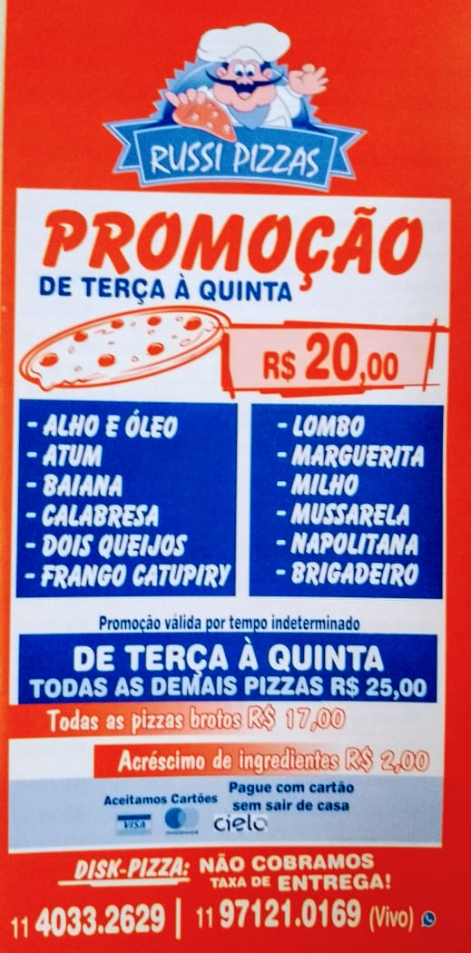 Welcome to Russi Pizzas, where every slice promises a tantalizing experience. Located in the heart of Bragança Paulista, this pizza haven is rapidly gaining a reputation for its exceptional offerings. The menu showcases an array of delightful pizzas, including the salivating Calabresa Acebolada topped with mozzarella and catupiry, along with the fresh Margherita and the savory Frango Bacon com Catupiry.